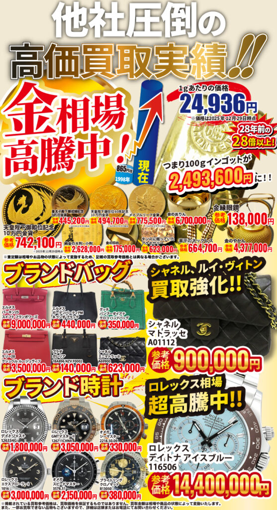 金・貴金属・ブランド品はもちろん、お値段がつくか迷われているものも是非お持ちください。